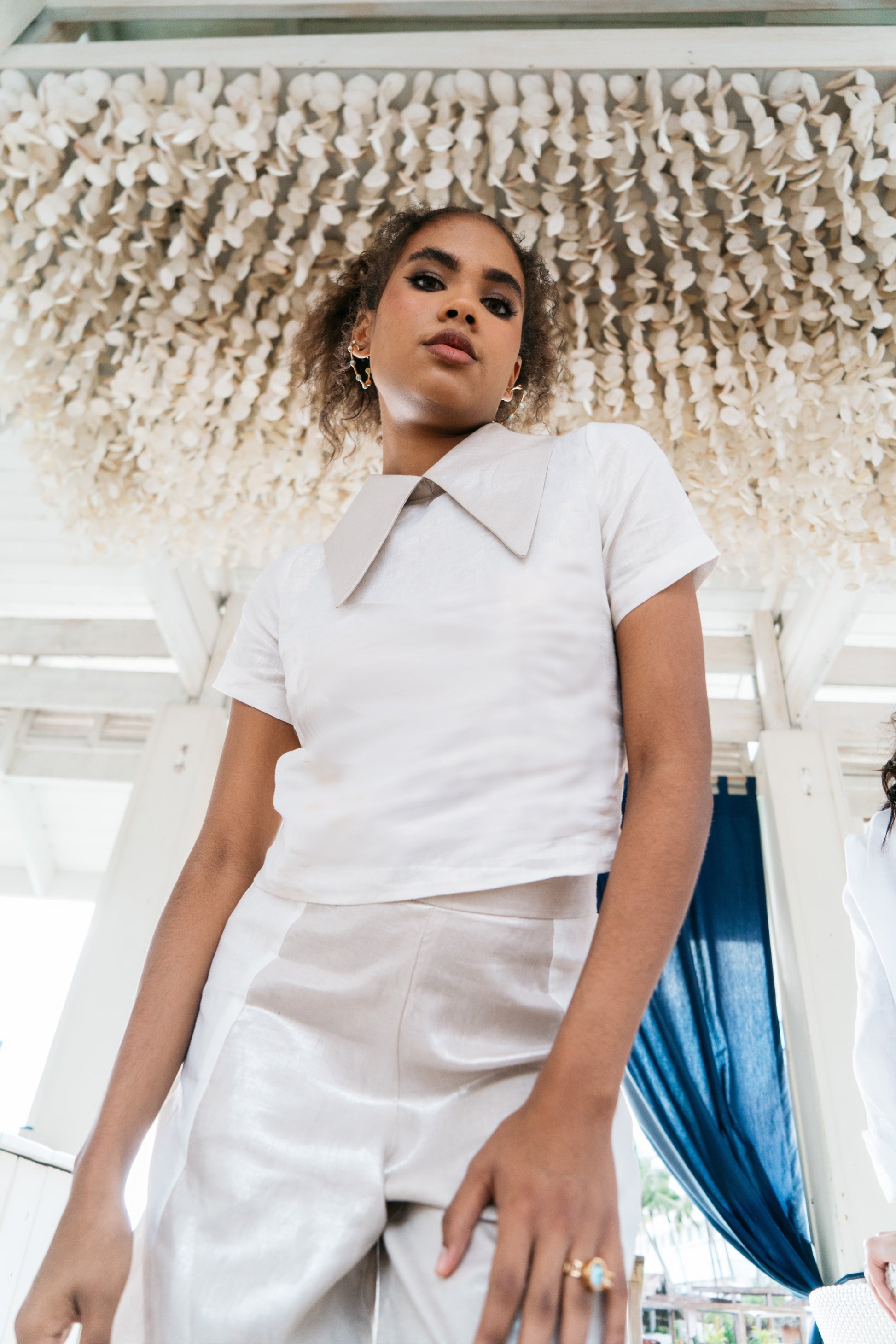 Imperail collar tulip sleeves two toned crop top & two tones palazzo.