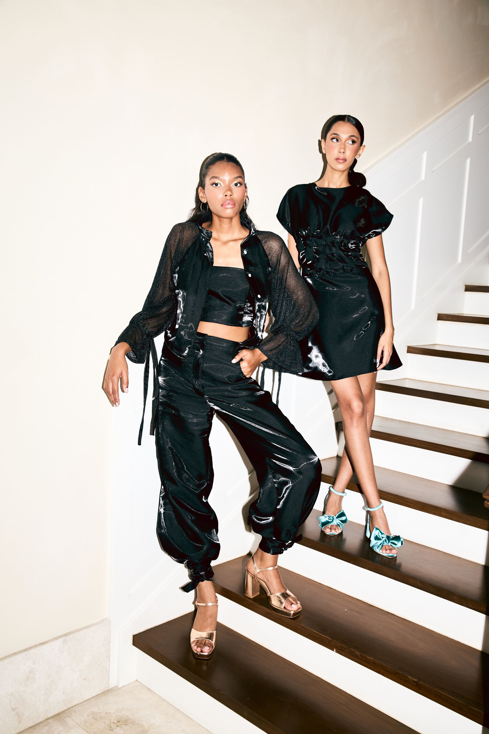 Sheer long-sleeve button-up top featuring subtle shimmer, soft cuffs, and lightweight drape.