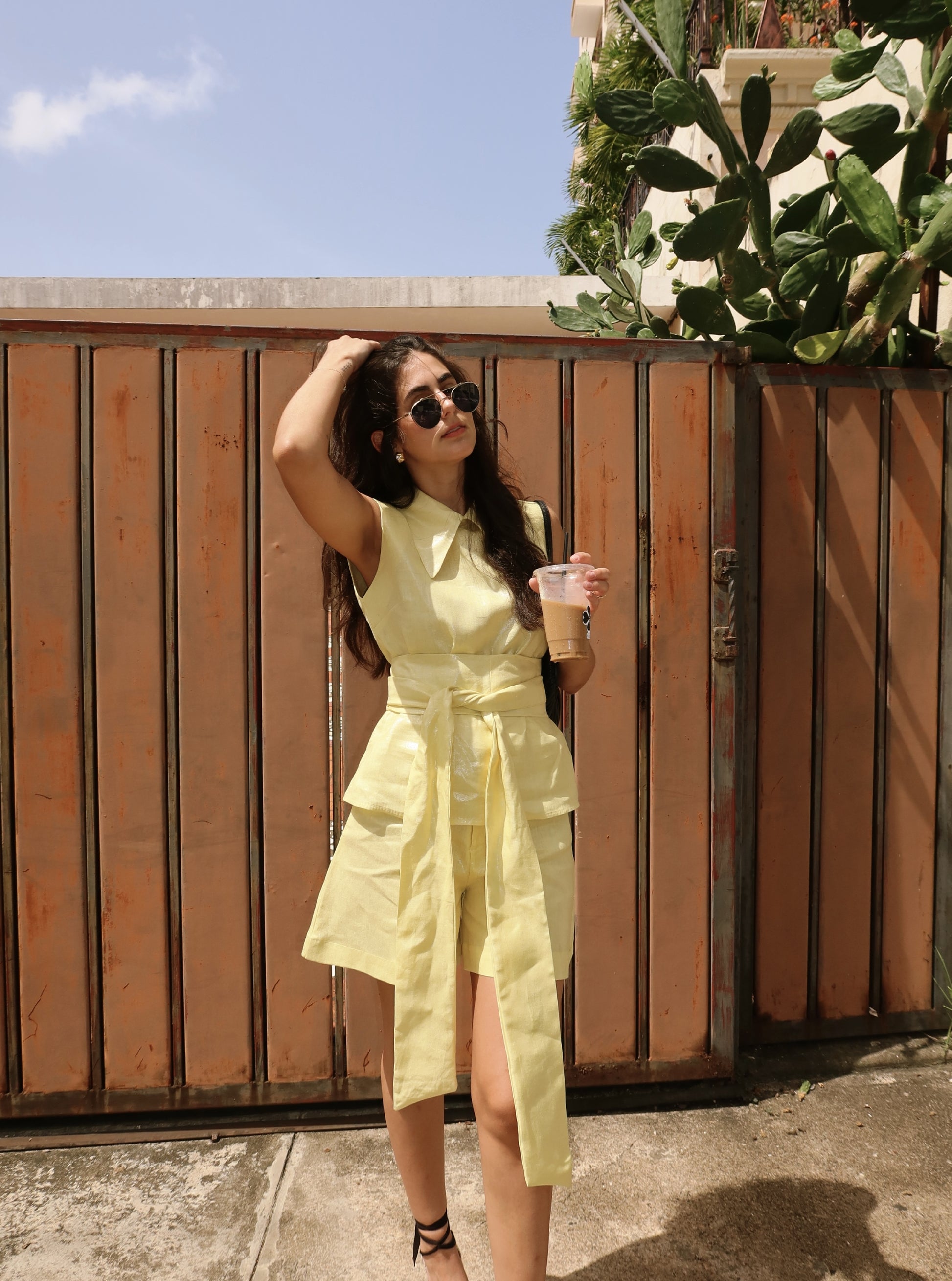Puritan collar Sleeveless top with wrapped around lace and palazzo pants.