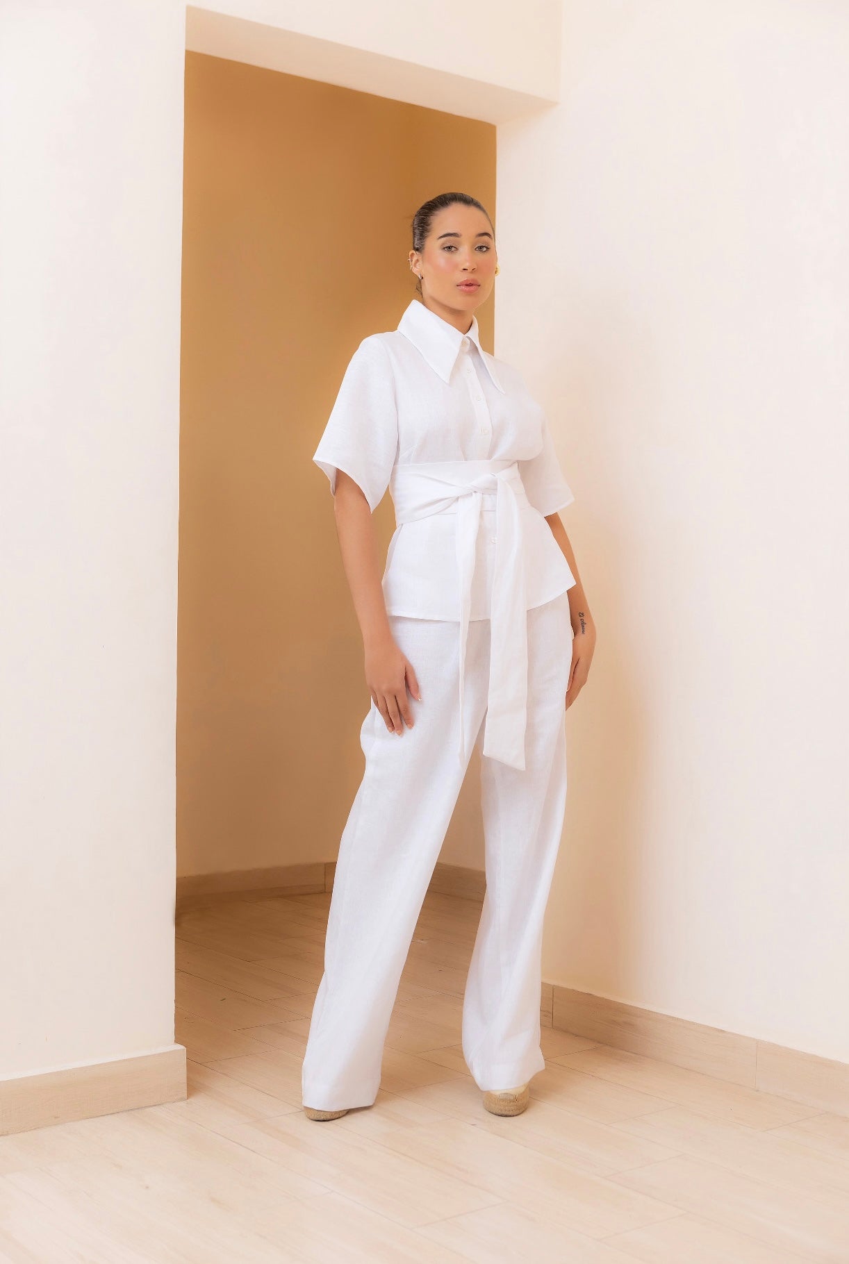 Puritan collar short sleeves top with wrapped around lace and palazzo pants.