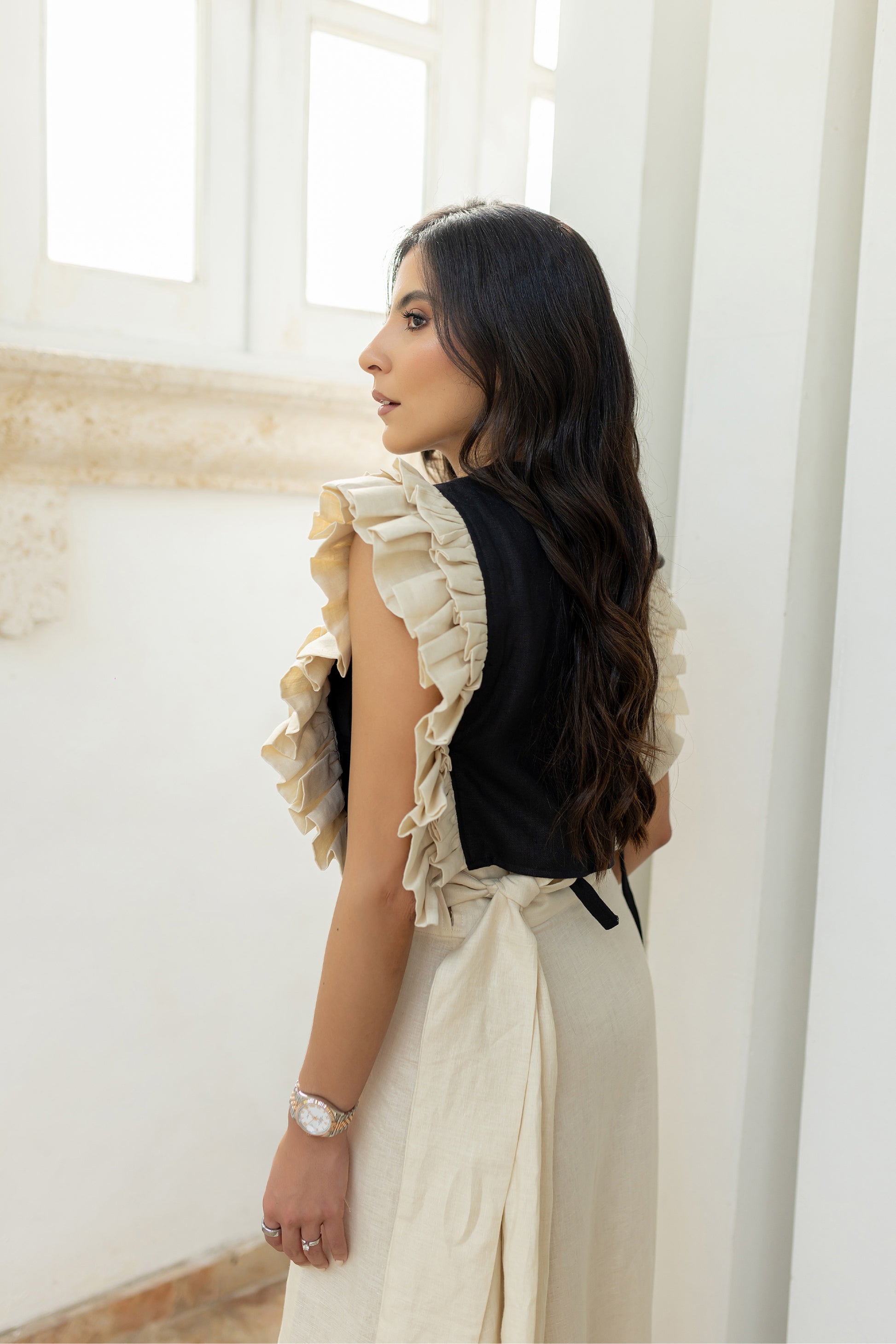 Bottom-down top with pleated details.