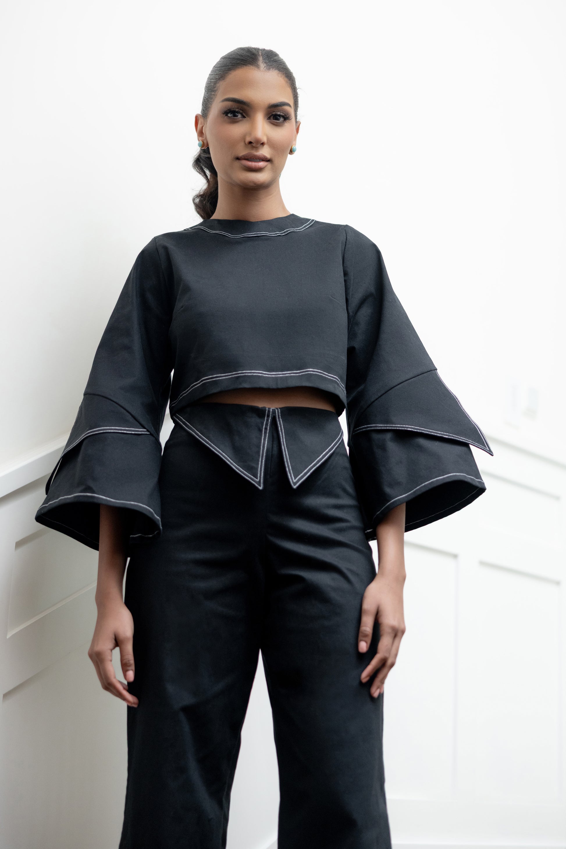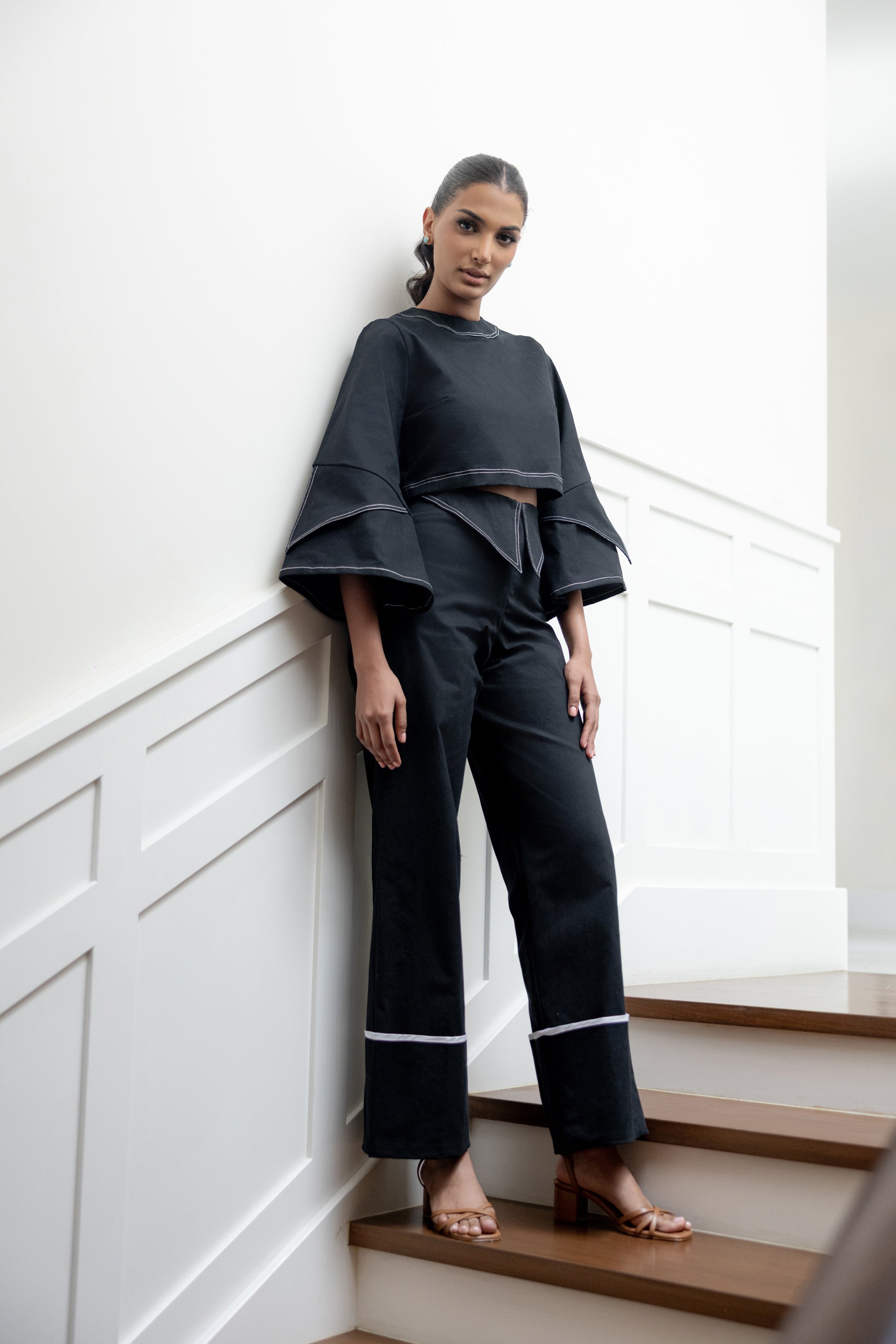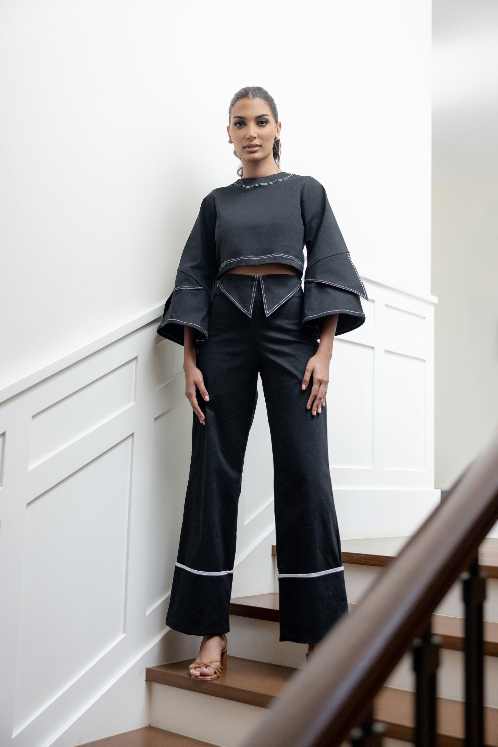 Long-Sleeve Bell Top & Palazzo Puritan Collar Details.