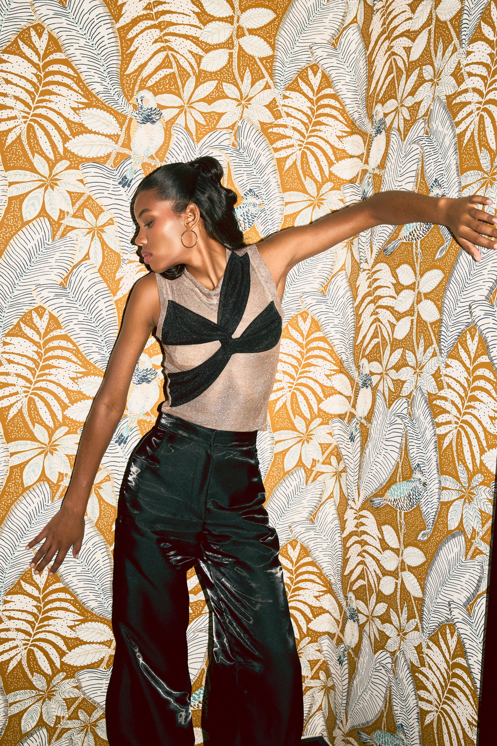 Sleeveless knit top metallic thread with contrasting crisscross appliqué detail.