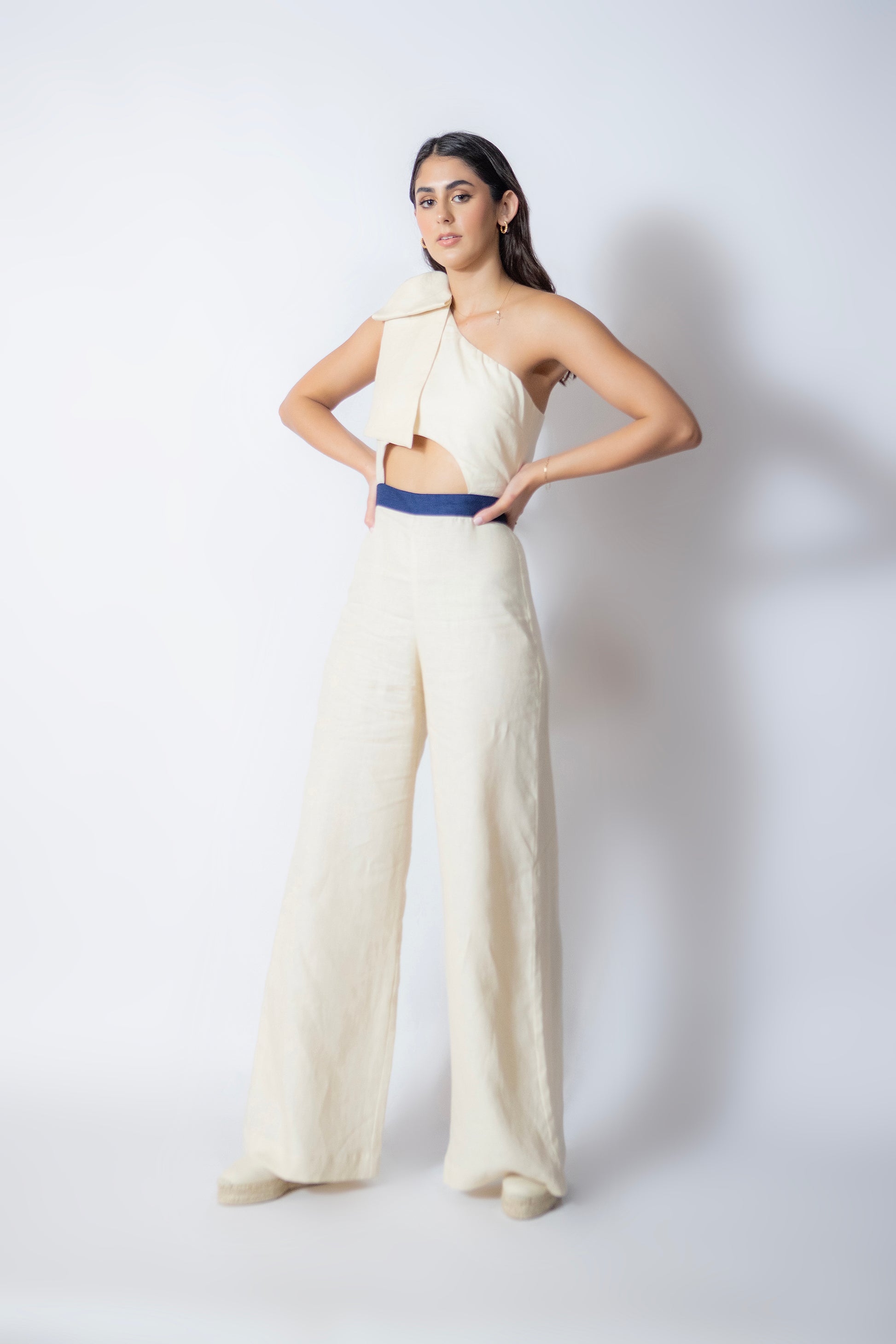 One shoulder cut-out top & palazo pants.